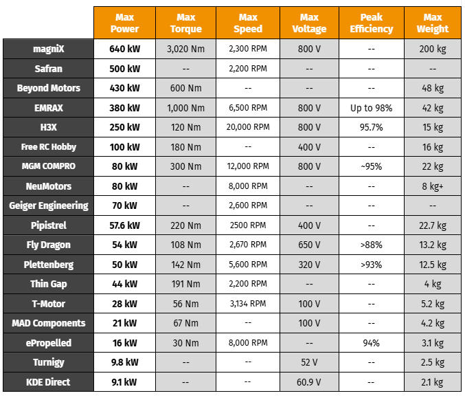 A new and ambitious player on the scene, H3X is a US-based company with aims to power large commercial aircraft like the Boeing 737. Their unique design combines the electric motor, inverter, and gearbox into a single unit. They currently have one model ready to order, the HPDM-30, with two larger models available for pre-order. Below are the performance characteristics for the HPDM-30: