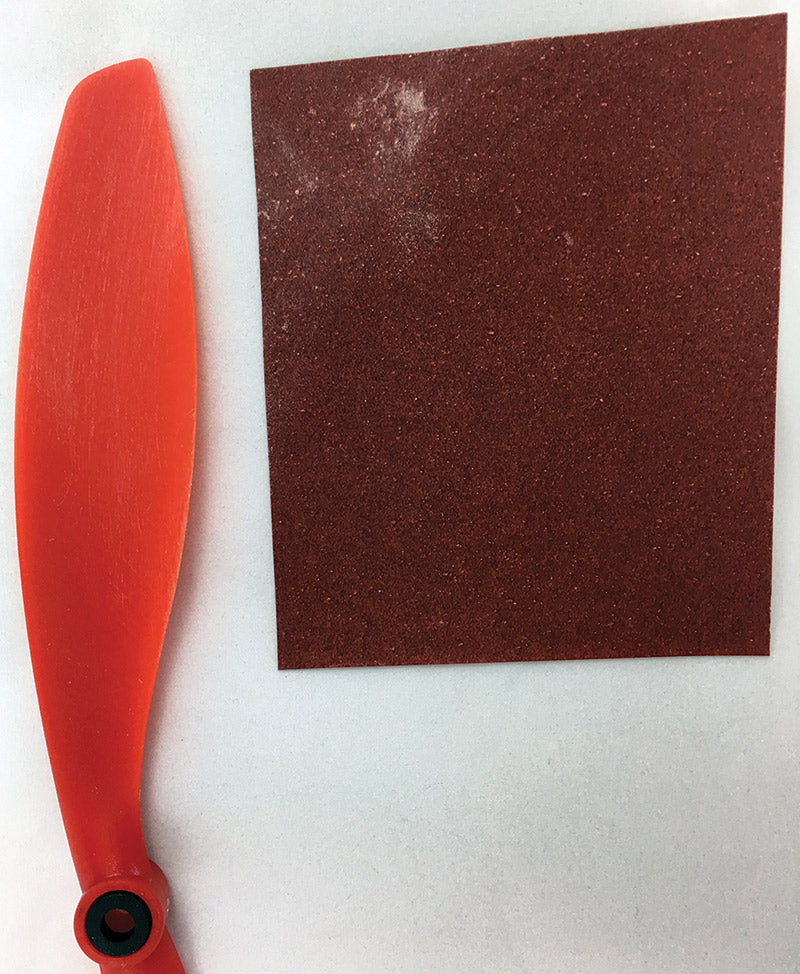 Sanding can be performed on props of certain materials like plastic. It is important to sand the underside of the prop to limit the aerodynamic impact on the boundary layer. Using a finer sand paper is ideal to leave a smooth finish, though many users will start with a rougher sand paper to remove the majority of material (100 - 220 grit), then finish with a finer paper (400 - 800 grit).